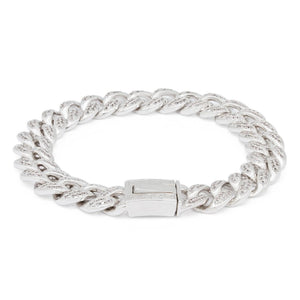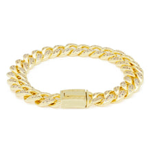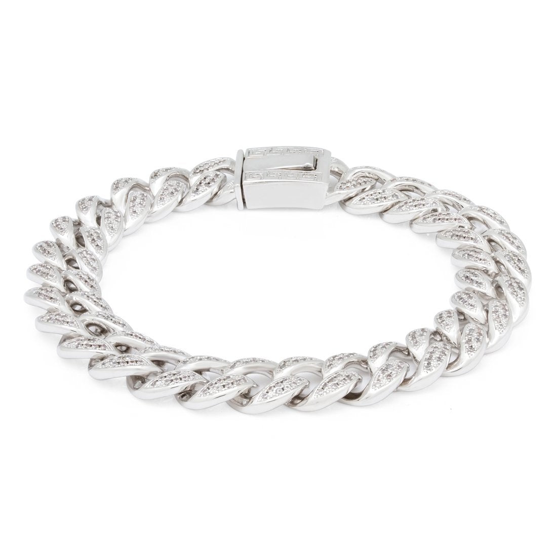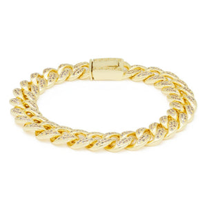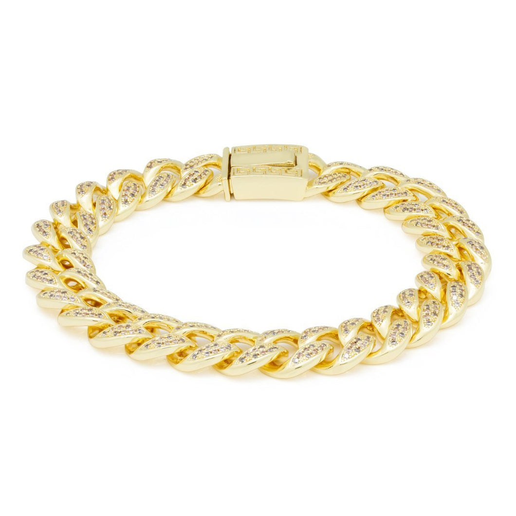 Made to match alongside the 12mm Iced Chain, each bracelet provides the perfect accessory thanks to its eye-catching appearance. Built using handset CZ stones, the 12mm Miami Cuban chain bracelet provides that iconic look in 14K Gold plating and white gold plating. The new and improved Greek Key push down clasp grants a secure, stylish look.